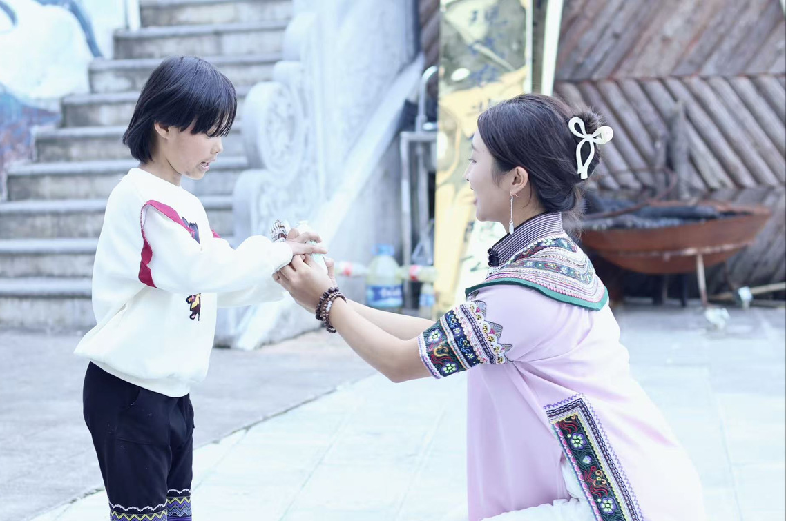 在被誉为“云中仙境”的阿者科村,袁老师与哈尼孩子一同跳起国家级非物质文化遗产——哈尼族“乐作舞”。他们以梯田为舞台、以夕阳为灯光,共赴一场民族艺术与自然相融的浪漫盛会。阳光下,孩子们服饰上的彝绣花纹熠熠生辉;舞动中,彝族姑娘帽檐的银铃清脆作响。她们的眼睛明亮如湖水,倒映着对未来的渴望。这不仅是一次舞蹈教学,更是一次文化的传承,让古老的民族艺术在新时代焕发出勃勃生机。