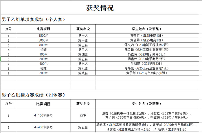 赛场上,我校运动员展现出卓越的竞技水平和昂扬的精神风貌。其中,GL25电商1班黄敬昇同学表现尤为突出,在中长跑项目中优势显著,一举夺得男子乙组1500米与5000米双料冠军,成为本届赛事的“双冠王”。