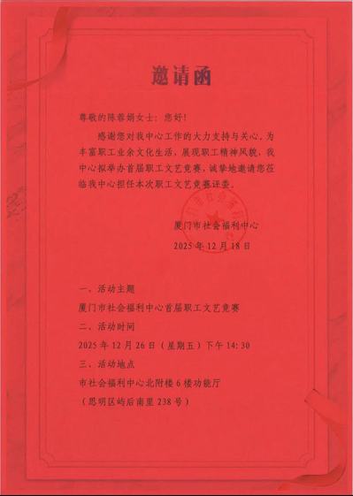 此外,教育学院教师也积极投身公益事业。2025年12月,陈珍妮老师和陈蓉娟老师于曾受邀参与厦门市社会福利中心职工文艺竞赛评审工作,以实际行动践行社会责任,提升学校社会影响力。